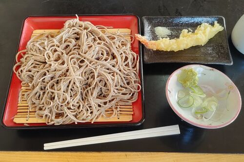 (つづき)13時ちょっと前に野沢温泉スキー場を出発し、帰路に就きます。 30分弱走ったところで、国道117号線沿いにある「奥信濃 まぼろしの蕎麦処 富倉そば支店」に入ります。 お店の入口には、メニューの写真が掲示してありました。 お店の入口では、蕎麦…