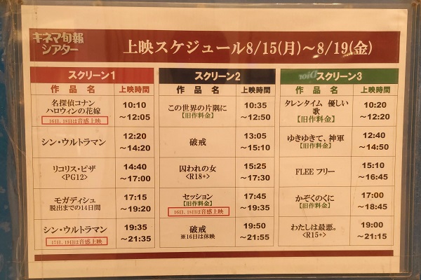 この週の上映スケジュール。先日観た「この世界の片隅に」は、この週までの上映です。