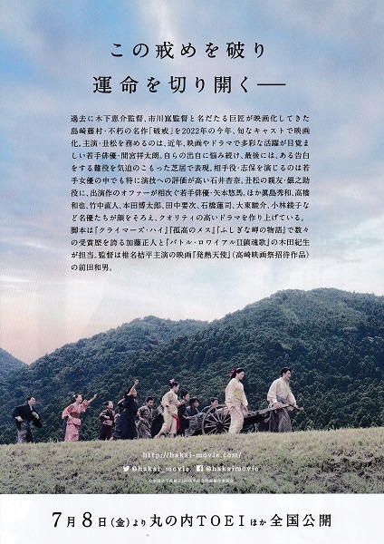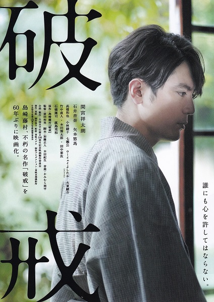 島崎藤村の名作「破戒」を原作に実写映画化した作品で、監督:前田和男、脚本:加藤正人・木田紀生。全国水平社(1922年(大正11年)に結成された戦前の部落解放運動団体)の創立100周年制作作品のようです。