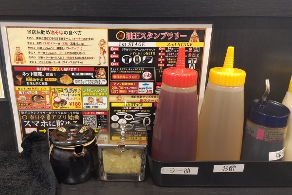 店内はカウンター席のみで9席ほどとこじんまりした造りです。カウンターには、辛味噌、刻みにんにく、ラー油、お酢、マヨネーズなどの調味料が並んでいます。