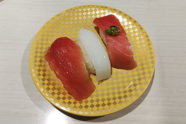 紅白三昧(300円)。まぐろ、いか、中とろの三貫です。いずれも美味しかった。