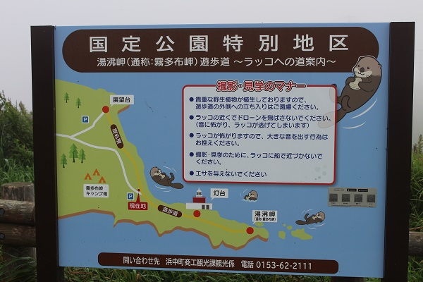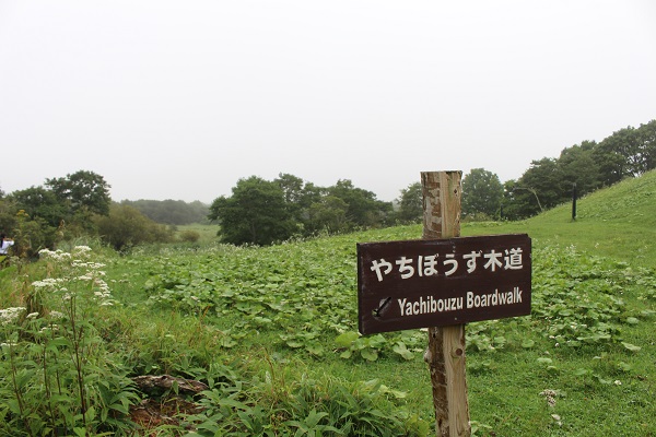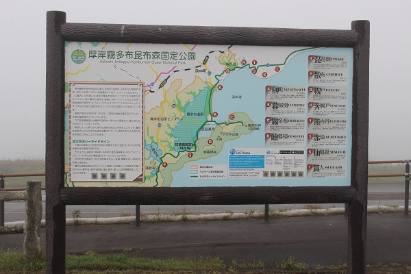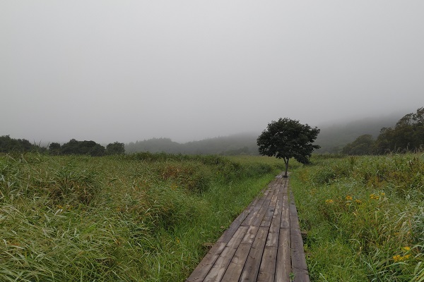 天気が良ければ、正面には湿原、反対側には海が一望できる展望台だそうですが、濃い霧で何も見えません。