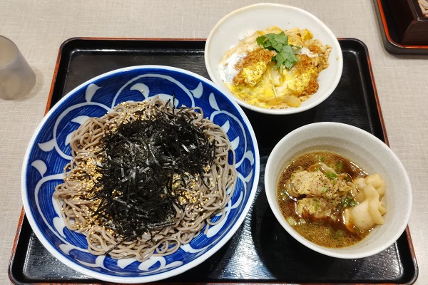 注文して10分ちょっとで、豚つけそば(1,084円)と小ひれかつ丼(439円)のセットが到着。