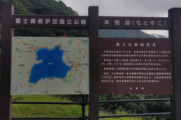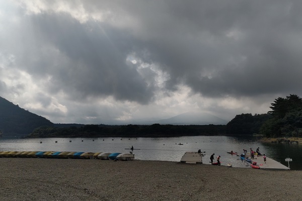 山田屋ホテルの近くに車を停め、一度湖畔に出てみます。カヌーか何かの大会が開かれるらしく、多くの人が集まっていました。後で検索してみたら、翌日から精進湖カヌー競技場で「日本カヌースプリントジュニア選手権大会」が開催されたみたいなので、準備のため先入りしていた人たちだったのだろうと思います。ここも富士山がきれいに見えるスポットのはずですが、やはり雲に隠れて見えませんでした。