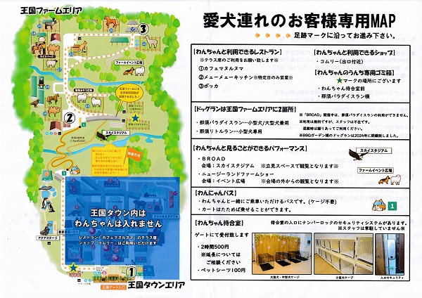 ただし、ペット向けのマップを入国(入園)時にもらいました。「王国タウン」エリアは入場禁止となっています。以前に来たときは、王国タウンの端にあるバーベキューガーデンだけは犬連れで入れたのですが、そこも入れなくなったようです。