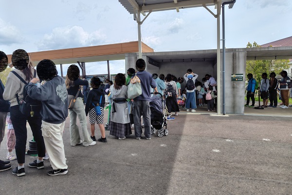 12時30分ごろ、ひととおり見て回ったので、帰りは無料のわんにゃんバスに乗ることにしますが、こちらもけっこうな乗車待ちの列ができています。