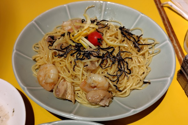 連れが食べた、海老・鶏肉・塩こんぶ・黒こしょうの濃厚鶏出汁ゆず塩スパゲティ(1,628円)。こちらもパスタは大盛です。
