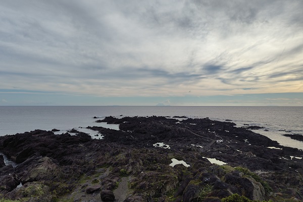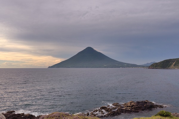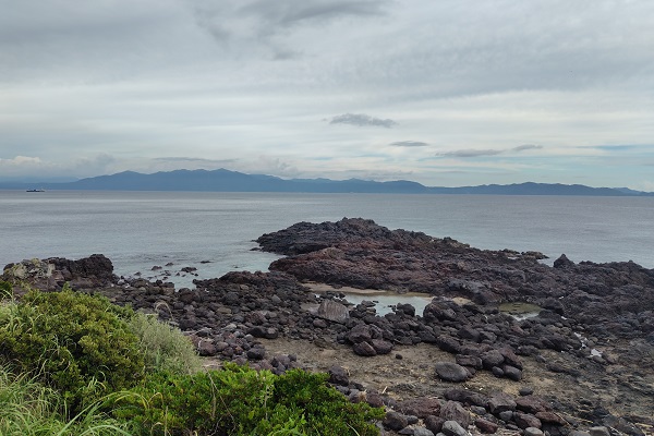 8キロ弱走った先の「指宿市開聞十町」交差点で県道243号(長崎鼻公園開聞線)→県道242号(川尻浦山川線)とさらに8キロ弱進んで、15時35分ごろ、長崎鼻公園の市の無料駐車場に車を停めます。