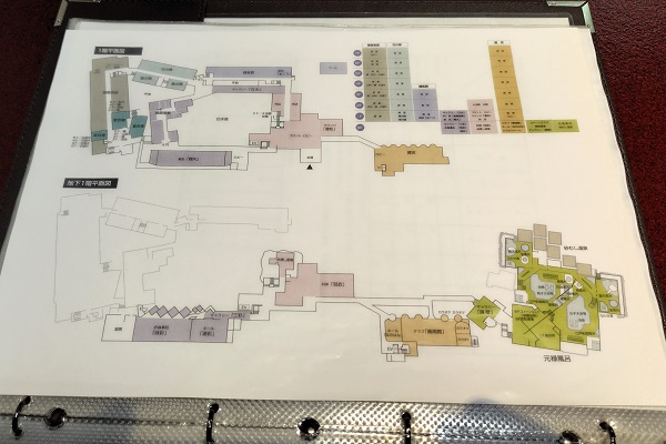 館内の案内図。離宮41室、磯客殿20室、花の棟69室、薩摩客殿66室の計196室と、かなり大きな宿です。