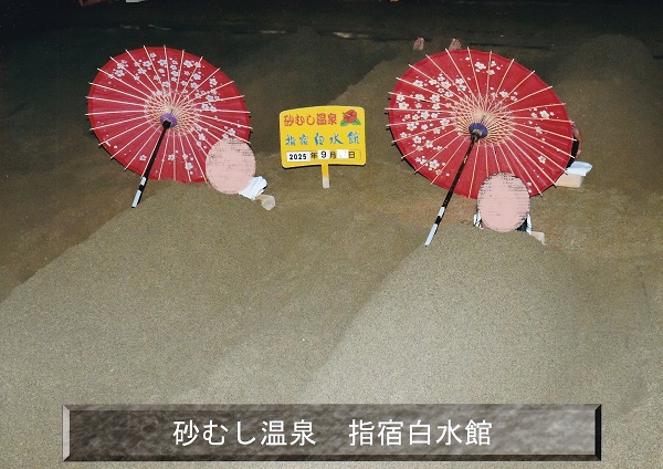 砂むし温泉自体は男女の区別はなく、カップルや男女が混じったグループも一緒に入浴?することができます。砂を均してくれたところに仰向けに横になると、スタッフがその周りの砂を掘って体の上に掛けて、首から下がすっぽり砂に埋まった形になります。10~15分ほどを目安に、体調に応じて、とのことでした。横になってちょっとすると、別のスタッフが記念写真の撮影を勧めにやってきました。せっかくの機会なので、1枚写真を購入しました。