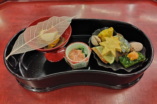 前菜。左から、添え透かしほう葉ともって葱 黒酢蒟蒻白酢掛け、とろろ芋鯛わた 紅景芋梅塩、秋鯖寿司 南瓜真丈 煎り銀杏、秋刀魚酢橘焼 苦瓜田楽味噌。