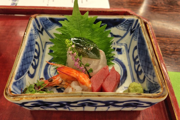 お造り:秋麗盛り。海老、タイ、マグロ。