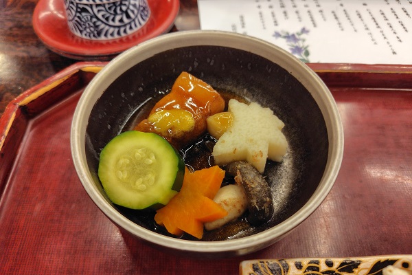炊合せ:黒豚角煮 紅景長芋 大国占地 紅景人参 青味。