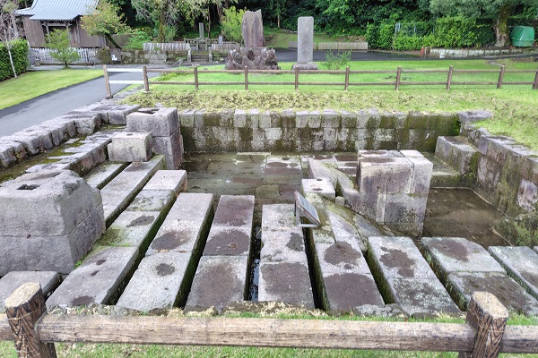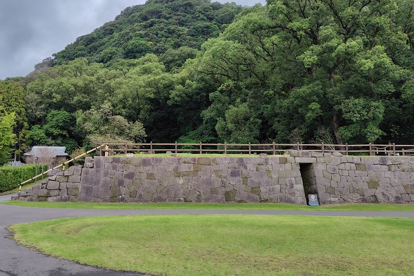 反射炉跡。当時は石組の上に16mほどの煙突型の炉が立っていましたが、火災により失われてしまったのだそうです。
