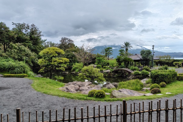 謁見の間近くの縁側から庭園の眺望。背後に桜島が見えますが、残念ながら山頂部には雲がかかっています。