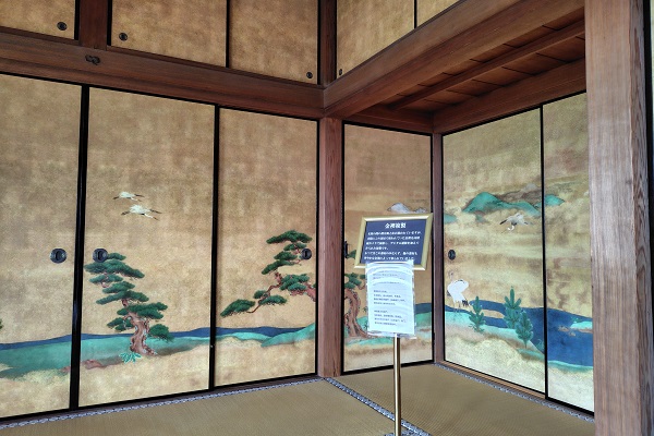 御小座(化粧の間)には、実際にこの部屋で使われていた金襖の複製が飾られていました。かつては、他の部屋でも金襖が使われていたそうです。