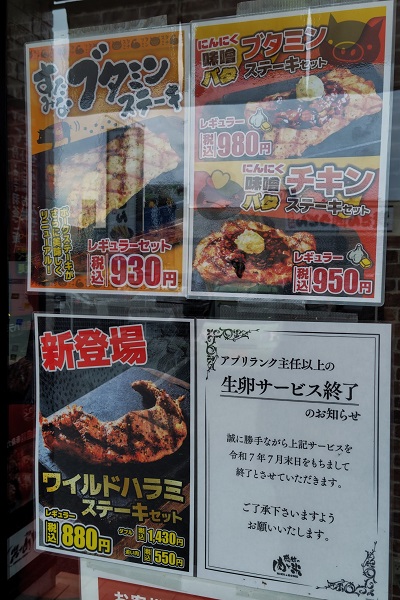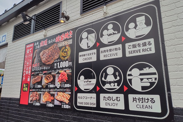 外の壁に掲示されていたメニューと利用方法の案内。前回訪問時と比べると、ロースステーキセットは変わりませんが、ハラミステーキセット、ヴォルケーノカルビセットなどは100円値段が上がっており、多少メニューが入れ替わっているようです。